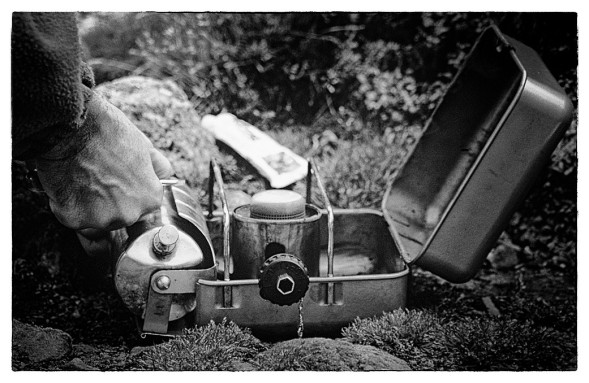 Un réchaud légendaire, qui n’aurait jamais pu fonctionner correctement sans l’ingéniosité, les modifications et les réglages apportés par l’un des porteurs de notre expédition — un as de la débrouille dont la réputation n’est plus à faire (l’appareil n’était pas adapté au pétrole disponible à l’époque).