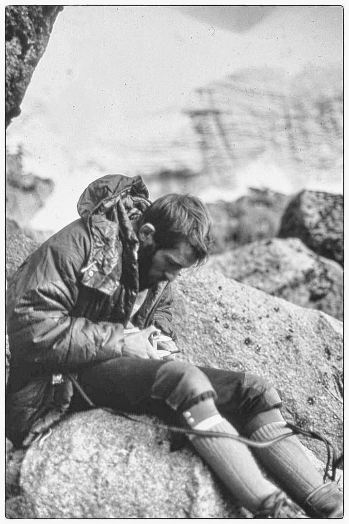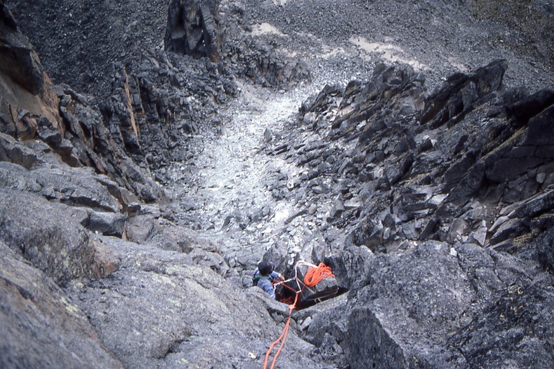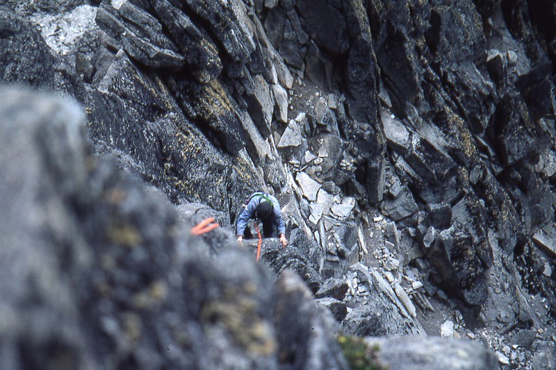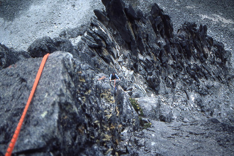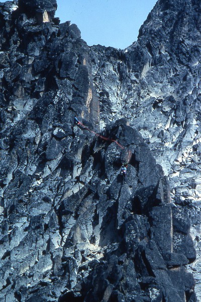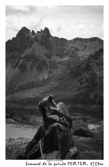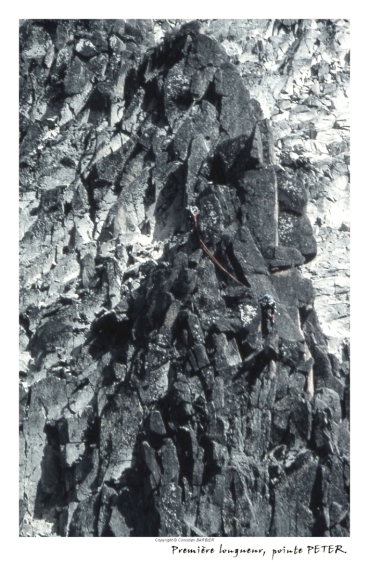 Nous sommes au col, nous laissons sur place nos sacs et une partie de notre "matos" que nous n'emmènerons pas dans notre ascension. Les deux premières longueurs ne présentent que peu de difficultés. Tout au long de cette ascension, nous ferons attention à chaque geste, pour ne pas déclencher, avec la corde qui nous relie, la chute de blocs en équilibre instable sur tout le parcours. C'est une arête magnifique et "relativement" aérienne, offrant tout de même de très mauvaises conditions de rocher. Le rocher est peu sûr, mais après en avoir pris l'habitude, ce rocher nous offre quelques belles sensations. Voilà sept longueurs que nous grimpons et après une huitième, relativement courte, nous voici au sommet. Nous sommes à 4757 mètres.