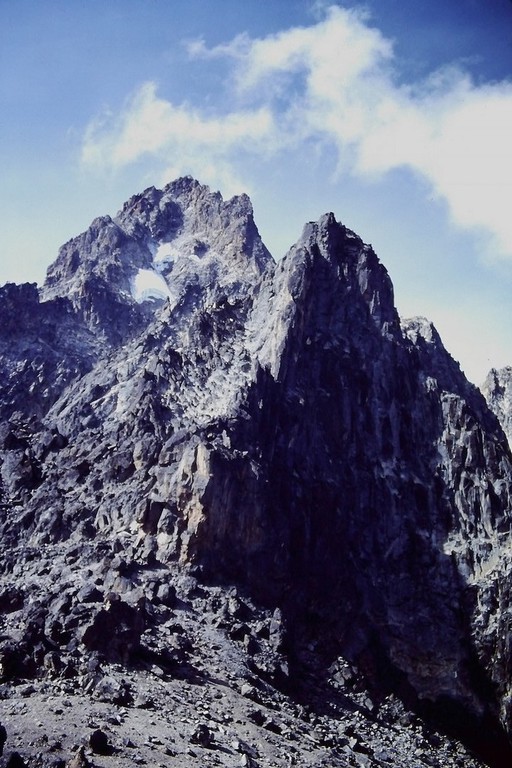 De cet endroit, la face nord du BATIAN, 5199 mètres, est impressionnante. Avec nos yeux, nous parcourons l'intégralité de la voie classique de la face et échangeons quelques points de vue sur la difficulté de cette paroie. Cette voie normale empruntée par deux alpinistes Kényan, rencontrés la veille à Kami-Hut, nous donne envie et ne nous fait pas oublier qu' il faut maintenant descendre.