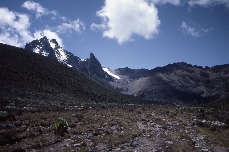 Août 1983, le Mont-KENYA est un volcan érodé, qui se dresse isolé au-dessus de la savane environnante. Il possède un caractère particulier. Le sommet présente un escarpement d'une hauteur de 800 mètres, implanté sur un socle de 90 kilomètres en forme de dôme. Autour, de profondes vallées s'y enfoncent. La faune et la flore y sont extraordinaires. Une épaisse forêt couvre ses pentes, et ce, jusqu'à l'altitude de 3000 mètres.