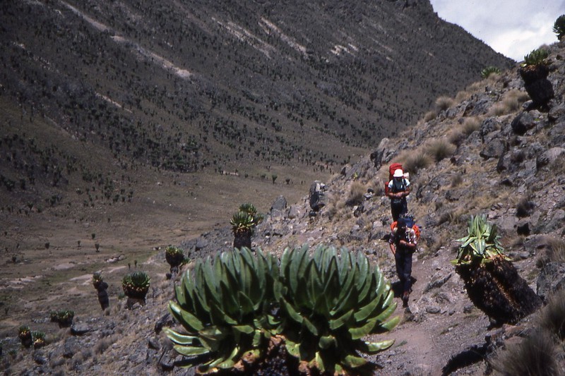 Après une nuit quelquen peu agitée, quand je pointe mon nez hors de la tente, en regardant sur ma gauche, je me rends compte que les "buffalos" sont venus nous rendre visite au petit matin, étant donné le nombre de bouses fraîches qui nous entourent... Sans plus attendre, nous plions nos tentes, puis déjeunons. Il est 8h30, nous partons pour la deuxième étape, en direction du camp de base, le MACKINDER. Voilà seulement trois jours que nous sommes partis et nous sommes déjà à une altitude respectable. Après la traversée d'une zone de forêt équatoriale, nous débouchons sur une énorme tourbière de pente (tourbière motteuse), le fameux bourbier décrit par David Belden dans "Alpi-Rando" d'avril 1979.