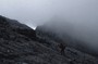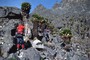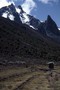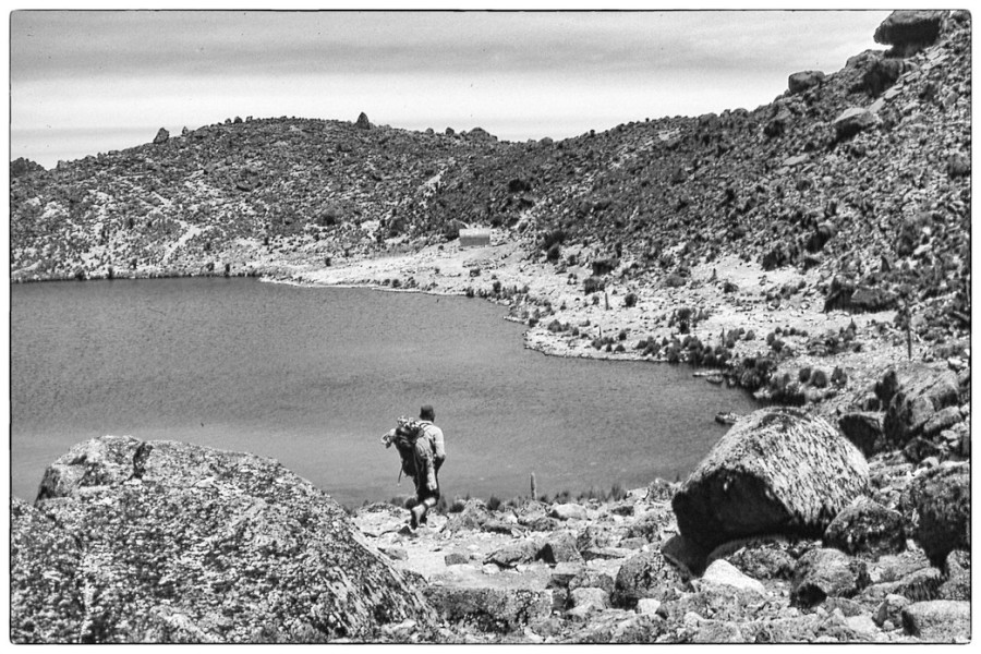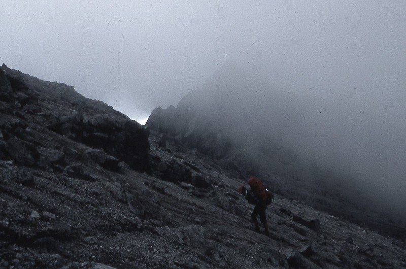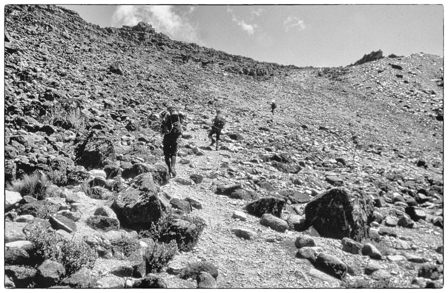 Cette année, la saison des pluies se prolonge, et sept heures de marche seront nécessaires pour atteindre le camp de base. Nous avons pataugé parfois jusqu'aux genoux, pendant deux heures dans l'ambiance glauque de cette tourbière (un vrai cauchemar). Les porteurs n'ont apparemment éprouvé aucune difficulté dans ce genre de terrain et sont déjà loin. Maintenant, mon sac se fait sentir sur mes épaules, le souffle est plus court, l'altitude fait son œuvre, nous sommes à plus de 4000 mètres.