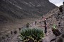 Ce matin, nous préparons nos sacs et nous partons en direction du refuge AUSTRIAN-HUT. Pour cela, il nous faut gravir 700 mètres de dénivelée, pour dormir à 4700 mètres. Le départ est donné pour une approche longue dans des éboulis morainiques verglacés. Notre acclimatation se fera en effectuant le tour du massif. Sur ce périple de 360° sur le Mont-KENYA, nous effectuerons l'ascension de la Pointe LENANA, 4985 mètres, sommet satellite des sommets principaux, le BATIAN, 5199 mètres et le NELION, 5188 mètres. Ce sommet ne comporte aucune difficulté, et c'est un sommet idéal pour les trekkeurs, souvent pris pour le sommet du Mont-KENYA par les agences locales peu scrupuleuses. Déjà, nous ressentons la fatigue liée à l'altitude et à la rigueur des conditions météo du moment. A cet instant, chacun semble perdu dans ses pensées. Il est 19h30 et mes maux de tête sont bien là, de plus en plus tenaces. Il fait froid et décidément, la météo n'est vraiment pas de la partie...