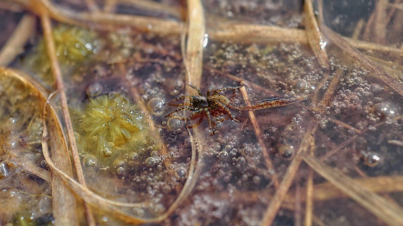 Comportement : elle marche souvent sur des substrats très humides, les sphaignes et parfois même sur la surface de l’eau, ce qui est moins fréquent chez les Arctosa de sable sec (lutetiana, cinerea).
