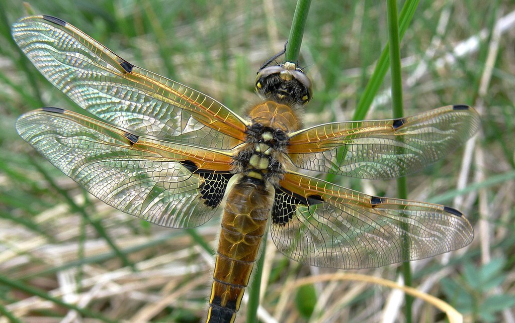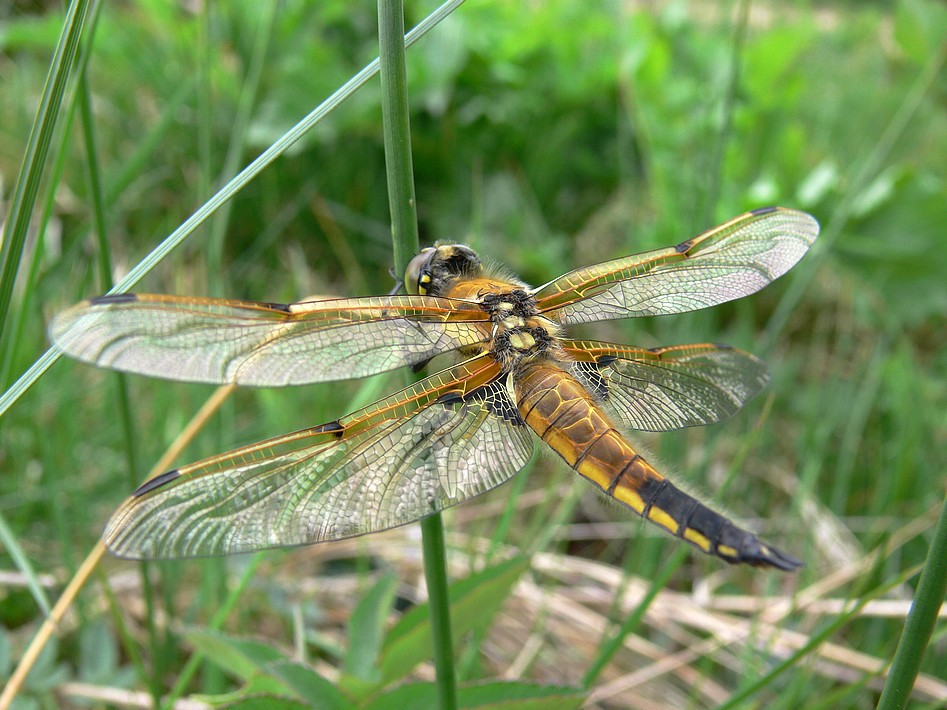 La "Libellule à quatre taches" correspond à l'espèce Libellula quadrimaculata, un insecte de la famille des Libellulidae. Elle est caractérisée par la présence de quatre taches sombres, une sur le nodus (une partie clé du bord antérieur) de chacune des quatre ailes, d'où son nom. Les ailes postérieures possèdent également une tache basale noire étendue, et les ailes sont légèrement ambrées vers l'avant. Le corps mesure entre 40 et 48 mm de long, avec une envergure de 64 à 80 mm.