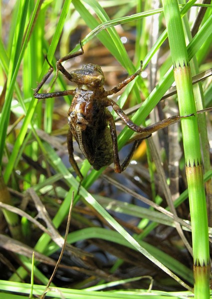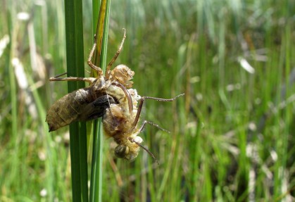 Après une demi-heure d'observation, je repère plusieurs exuvies accrochées aux herbes hautes, partiellement immergées. C'est actuellement la meilleure période pour assister à ces émergences, entre mai et juin. En progressant, je fais involontairement s'envoler de jeunes libellules récemment sorties de leur enveloppe. Puis j'aperçois une larve quittant l'eau et s'apprêtant à grimper sur une grande herbe. Après avoir vécu près de trois ans sous la surface, cette créature venue d'un autre monde va, sous mes yeux, se transformer en libellule pendant un processus qui durera environ sept heures. Pour moi la patience est de mise.